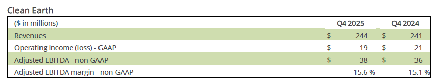 Clean Earth revenues totaled $244 million in the fourth quarter of 2025, a 1% increase over the prior-year quarter primarily as a result of higher services pricing and higher volumes within its hazardous materials business. The segment’s GAAP operating income was $19 million and Adjusted EBITDA was $38 million in the fourth quarter of 2025. These figures compare with GAAP operating income of $21 million and Adjusted EBITDA of $36 million in the prior-year period. The year-on-year improvement in adjusted earnings is attributable to the above-mentioned factors, partially offset by lower soil-dredge business contributions and higher incentive compensation. As a result, Clean Earth’s Adjusted EBITDA margin was 15.6% in the fourth quarter of 2025 versus 15.1% in the comparable quarter of 2024.