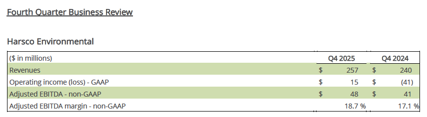 Harsco Environmental revenues totaled $257 million in the fourth quarter of 2025, an increase of 7.0% percent compared with the prior-year quarter. This revenue increase is primarily attributable to higher services demand including from new contracts and FX translation impacts, partially offset by lower eco-products revenues. The segment’s GAAP operating income was $15 million and Adjusted EBITDA totaled $48 million in the fourth quarter of 2025. These figures compare with a GAAP operating loss of $41 million and Adjusted EBITDA of $41 million in the prior-year period. The year-on-year change in adjusted earnings reflects the above-mentioned factors as well as improvement initiatives and the recovery of certain sales tax expenses in Brazil. As a result, Harsco Environmental’s Adjusted EBITDA margin was 18.7% in the fourth quarter of 2025 versus 17.1% in the comparable quarter of 2024.