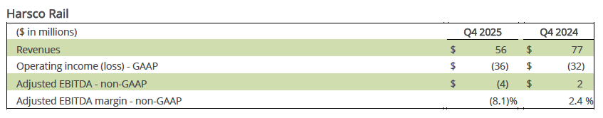 Harsco Rail Adjusted EBITDA of $(26) million to $(19) million, which is below 2025 results as a result of lower standard equipment and contracted services demand and related manufacturing inefficiencies, partially offset by cost-out activities and benefits.