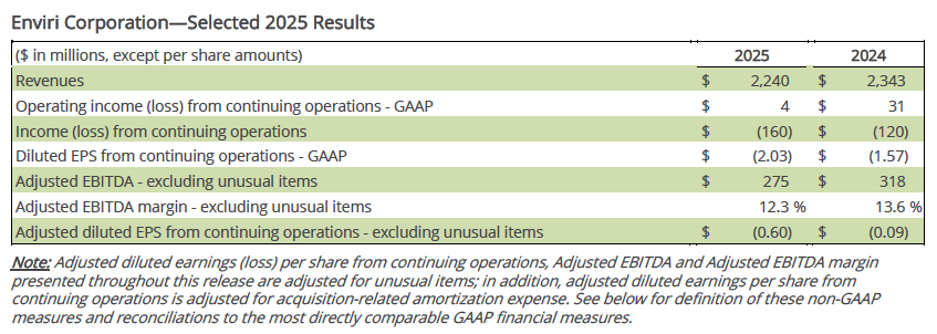 Enviri Corporation Reports Fourth Quarter and Full Year 2025 Results