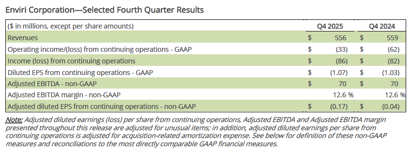 PHILADELPHIA (Feb. 24, 2026) – Enviri Corporation (NYSE: NVRI) (the “Company”) today reported fourth quarter and full year 2025 results. Revenues in the fourth quarter of 2025 totaled $556 million, and on a U.S. GAAP (“GAAP”) basis, the consolidated loss from continuing operations was $86 million. Adjusted EBITDA was $70 million in the fourth quarter of 2025.